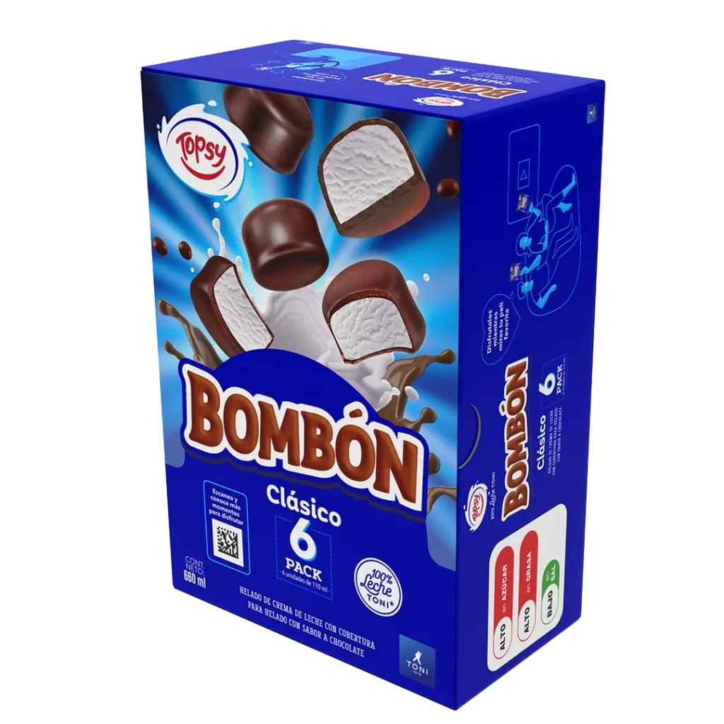 Todo lo que te gusta de Topsy en formato snack para esos antojos ¡on the go! Cremoso helado elaborado con 100% leche toni en forma de bombones sabor vainilla y cobertura de chocolate.