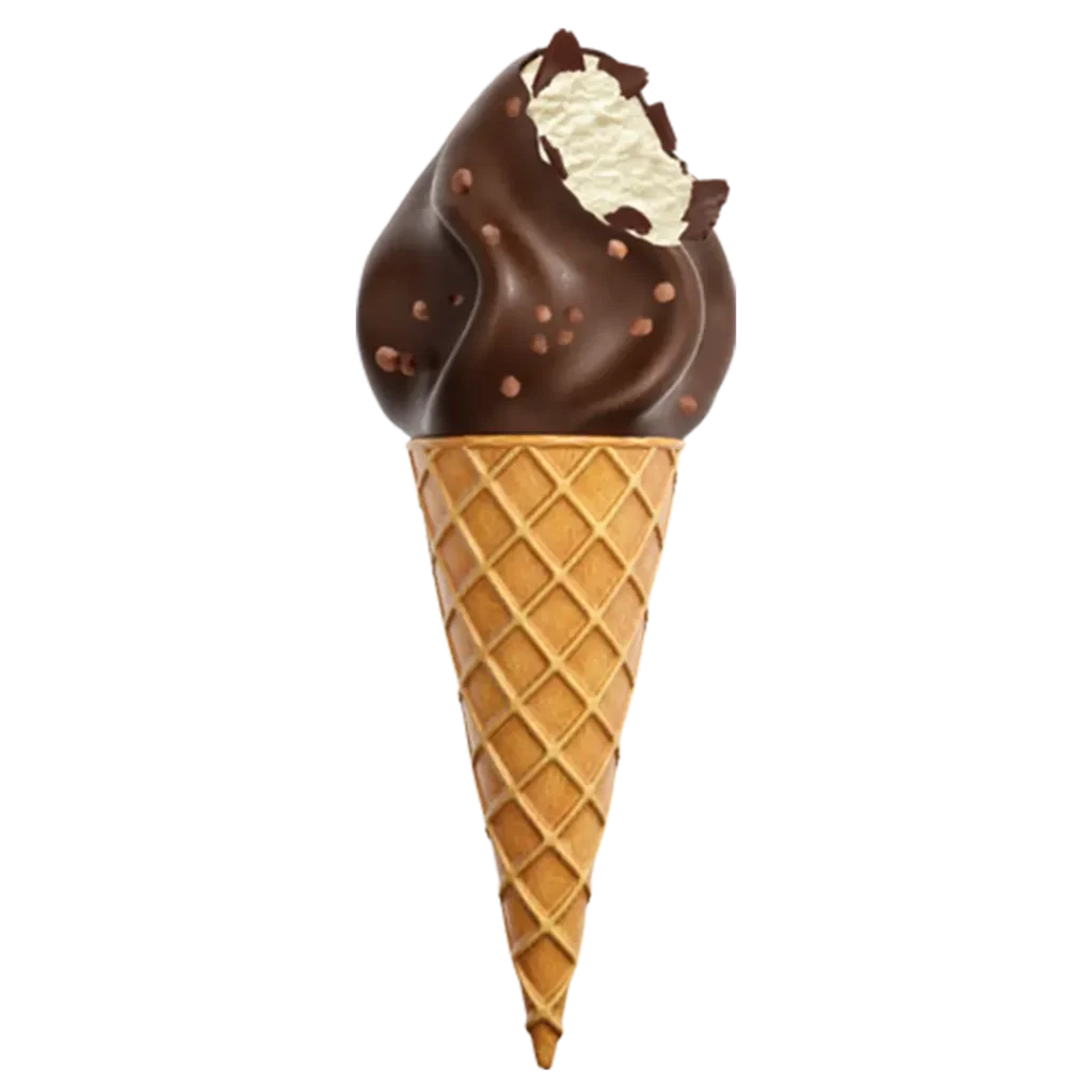 Cono de helado de vainilla, elaborado con 100% leche Toni, en forma de flama con cobertura de chocolate y arroz crocante.