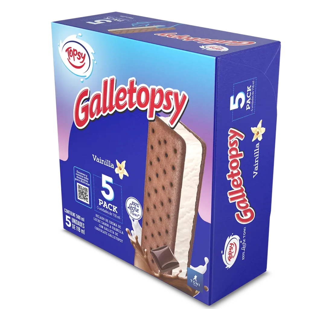 Helado en formato sanduche para quienes quieren disfrutar de la cremosidad única de Topsy junto a lo rico de las galletas de chocolate.