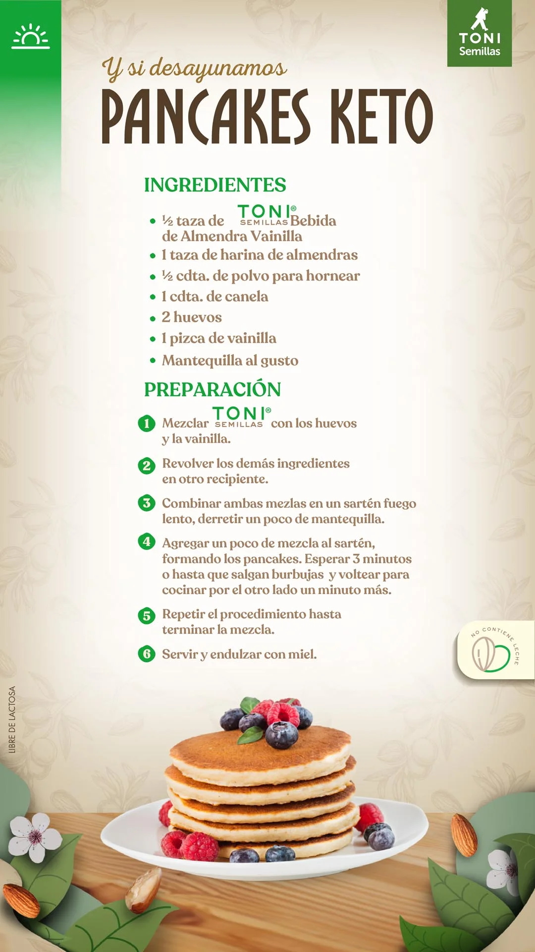 Pancakes Keto elaborada con productos ecuatorianos Toni para lograr sabor y practicidad. Usamos Toni Semillas Bebida de Almendra, de origen vegetal y fortificada con calcio y vitaminas A y D, ideal para recetas dulces y saladas. Receta pensada para el día a día: pocos pasos, ingredientes accesibles y resultados deliciosos.