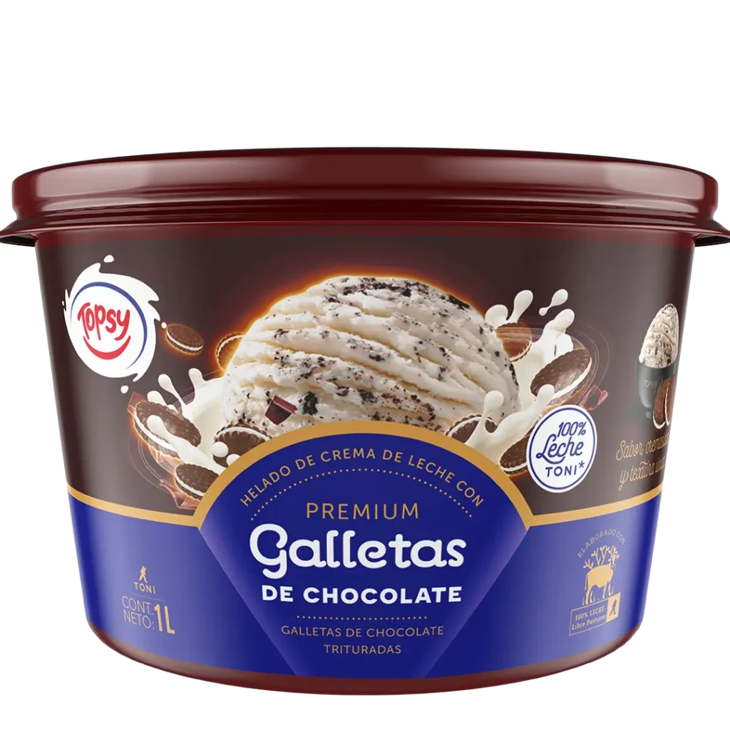 ¡Que bien sabe compartir! Disfruta nuestros litros de helado Topsy con los que más quieres. Cremoso helado con 100% leche Toni y sabor vainilla con trozos de galleta de chocolate