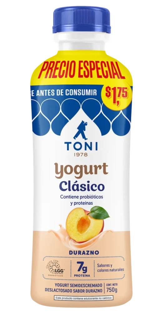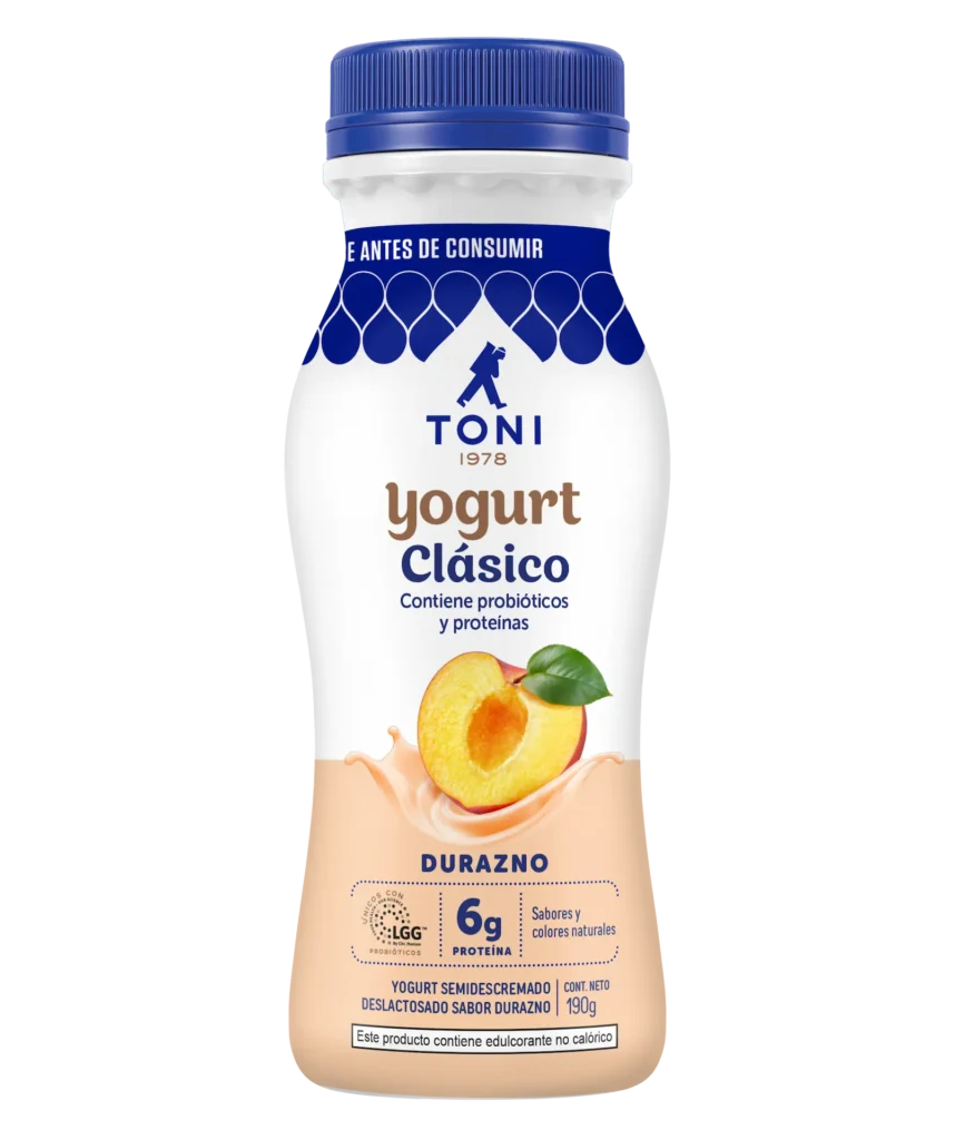 Yogurt Toni Clásico es un alimento funcional por su contenido nutricional y sus beneficios: contiene proteínas, únicos en probiótico LGG, es reducido en azúcar, no tiene espesantes y esta elaborado con sabores y colores naturales. Prefereido por sus delciosos sabores y consistencia, es una opción ideal para el desayuno y los momentos de snacking dentro y fuera del hogar. Sus sabores son: Frutilla, Durazno, Vainilla y Mora.