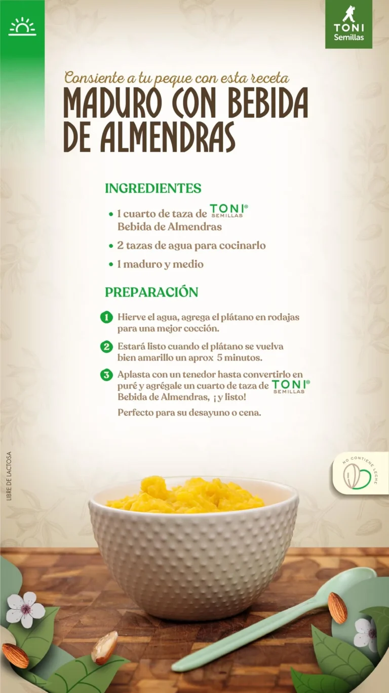 Maduro con bebida de almendras. Preparación sencilla con Toni Semillas o Manjar Toni según receta.