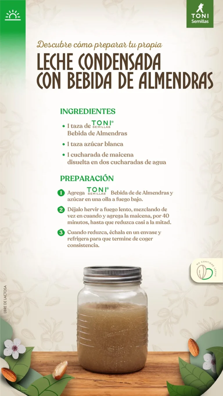 Leche condensada con bebida de almendras. Preparación sencilla con Toni Semillas o Manjar Toni según receta.